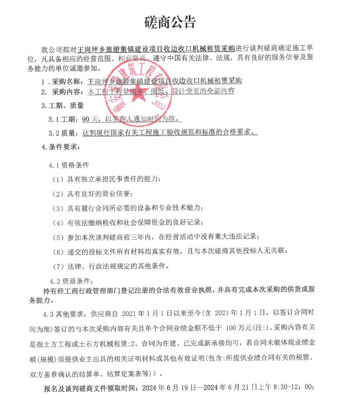 王崗坪鄉(xiāng)旅游集鎮(zhèn)建設(shè)項目收邊收口機(jī)械租賃采購談判磋商公告