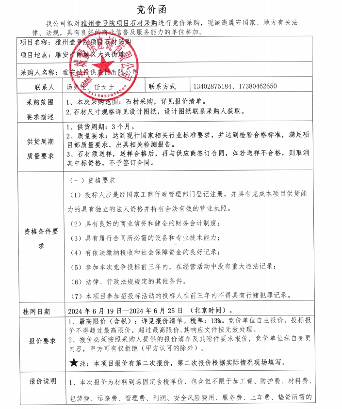 雅州壹號院項目石材采購競價公告