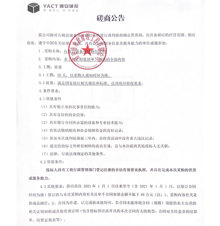 石棉縣儲(chǔ)備項(xiàng)目路燈采購談判磋商公告