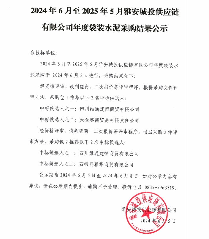 2024年6月至2025年5月雅安城投供應(yīng)鏈有限公司年度袋裝水泥采購結(jié)果公示