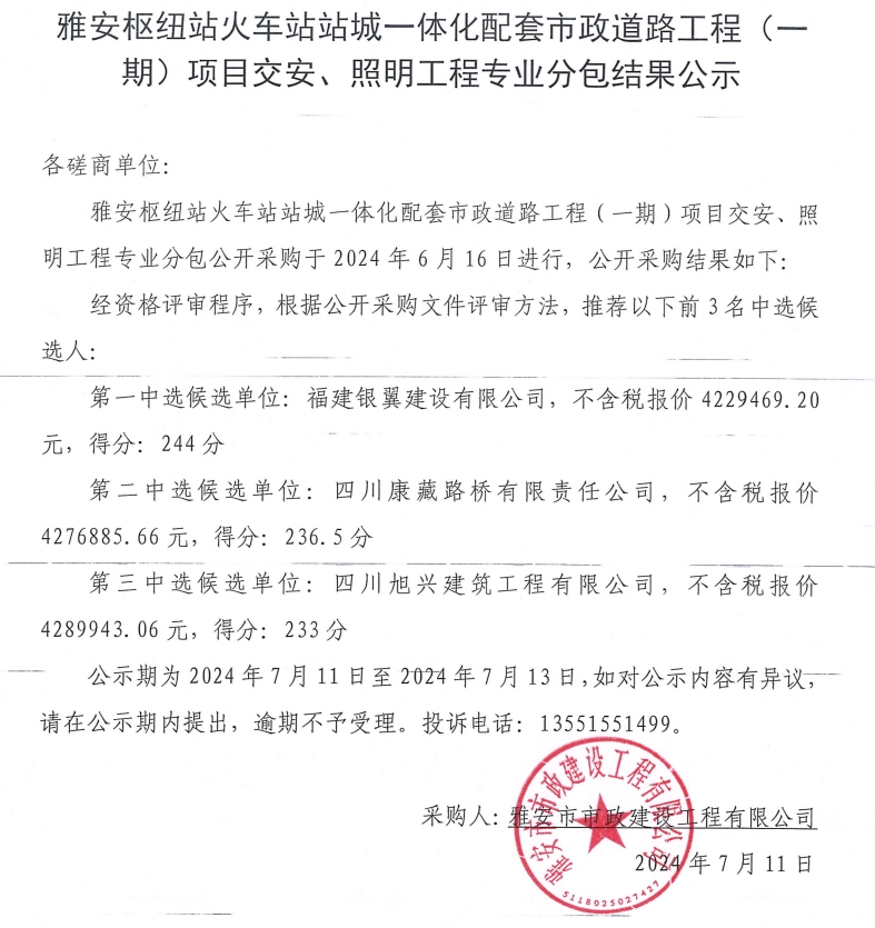 雅安樞紐站火車站站城一體化配套市政道路工程(一期)項(xiàng)目交安、照明工程專業(yè)分包結(jié)果公示
