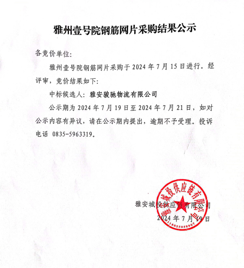 雅州壹號院鋼筋網片采購結果公示