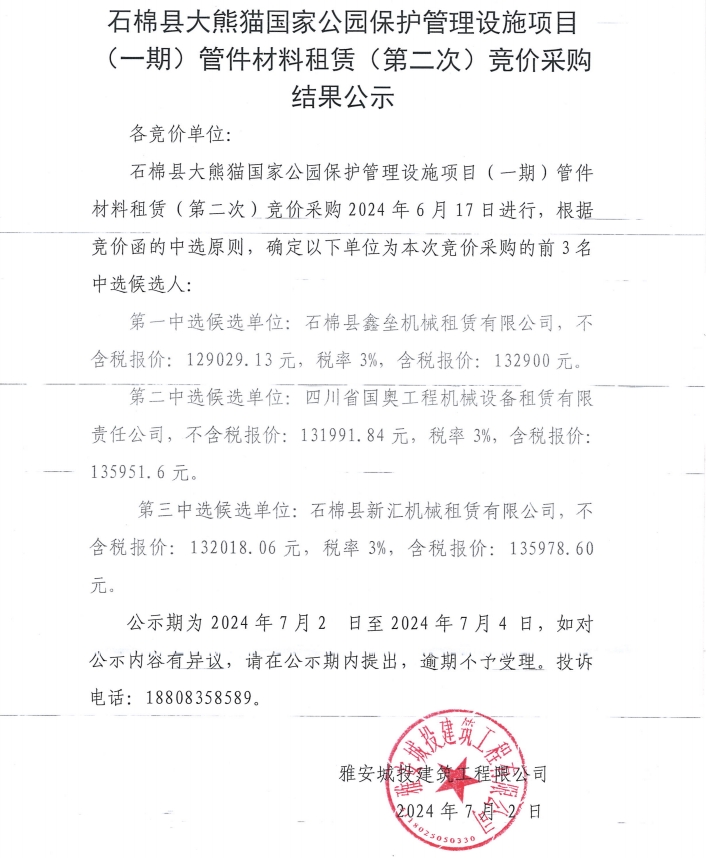 石棉縣大熊貓國家公園保護管理設(shè)施項目(一期)管件材料租賃(第二次)競價采購結(jié)果公示
