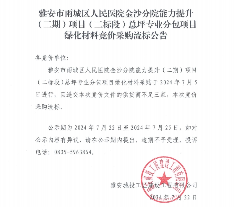 雅安市雨城區(qū)人民醫(yī)院金沙分院能力提升(二期)項(xiàng)目(二標(biāo)段)總坪專業(yè)分包項(xiàng)目綠化材料競價(jià)采購流標(biāo)公告