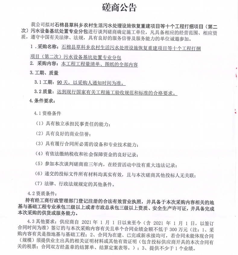 石棉縣草科鄉(xiāng)農(nóng)村生活污水處理設(shè)施恢復(fù)重建項(xiàng)目等十個(gè)工程打捆項(xiàng)目(第二次) 污水設(shè)備基坑處置專(zhuān)業(yè)分包采購(gòu)談判磋商公告