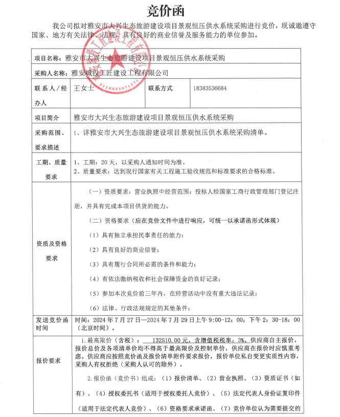 雅安市大興生態(tài)旅游建設(shè)項目景觀恒壓供水系統(tǒng)采購競價公告