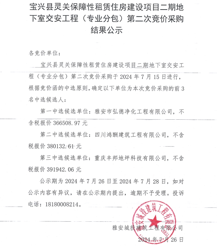寶興縣靈關(guān)保障性租賃住房建設(shè)(二期)地下交安工程(專業(yè)分包)第二次競(jìng)價(jià)采購(gòu)結(jié)果公示