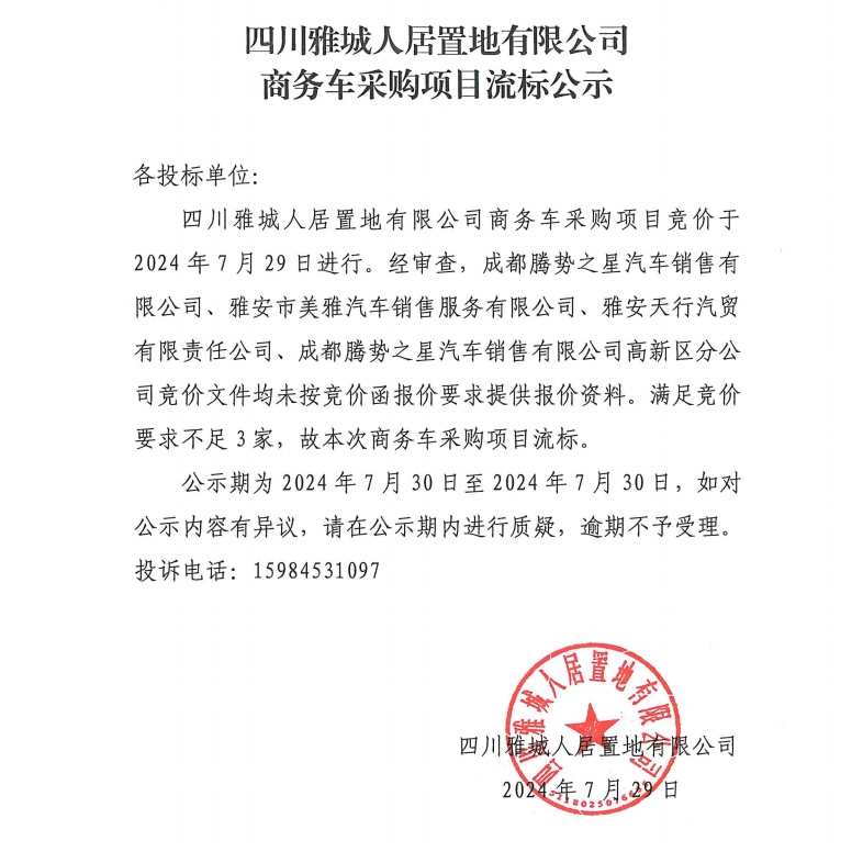 四川雅城人居置地有限公司商務(wù)車采購(gòu)項(xiàng)目流標(biāo)公示