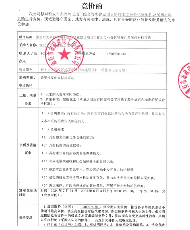 雅安市大興片區(qū)地下綜合管廊建設(shè)項(xiàng)目給排水專業(yè)分包管配件及閘閥材料采購競價(jià)公告