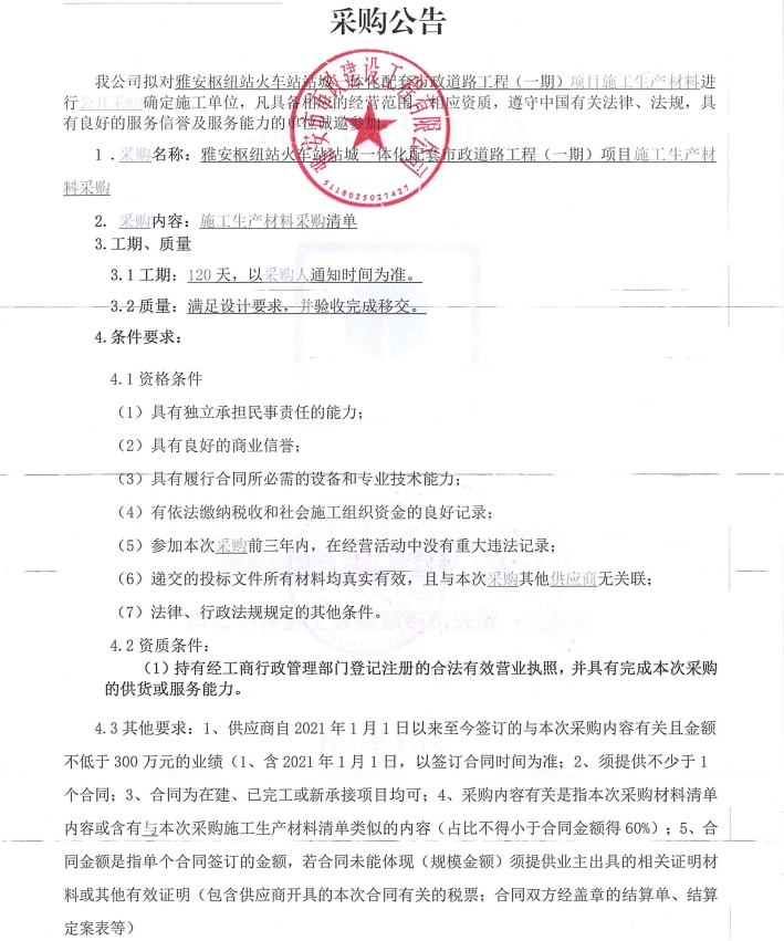 雅安樞紐站火車站站城一體化配套市政道路工程(一期)項(xiàng)目施工生產(chǎn)材料采購(gòu)公告