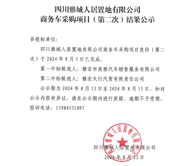 四川雅城人居置地有限公司商務車采購項目(第二次)結(jié)果公示