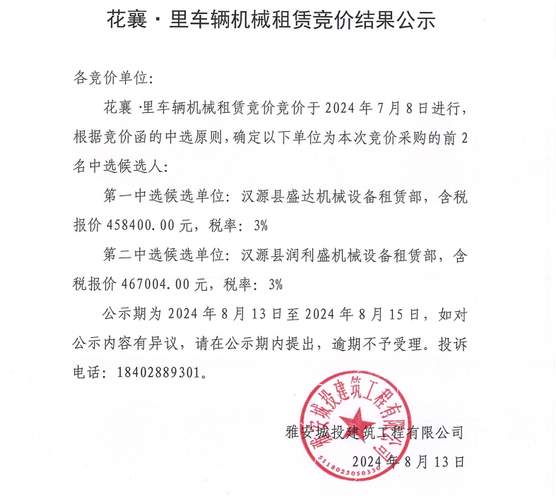 花襄·里項(xiàng)目車輛機(jī)械租賃競價結(jié)果公示