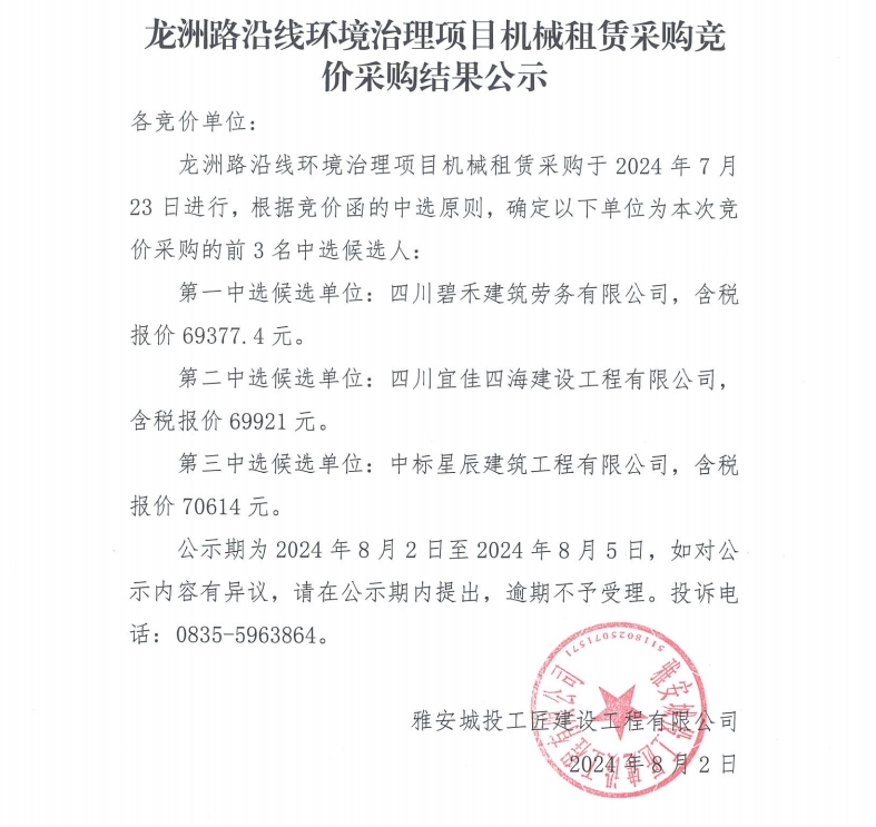 龍洲路沿線環(huán)境治理項(xiàng)目機(jī)械租賃采購競價(jià)采購結(jié)果公示