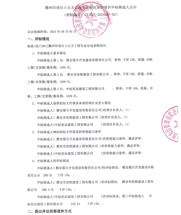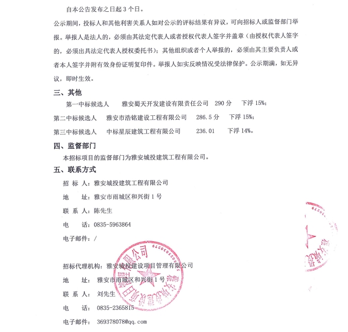 雅州印項目土石方工程專業(yè)分包采購項目中標候選人公示
