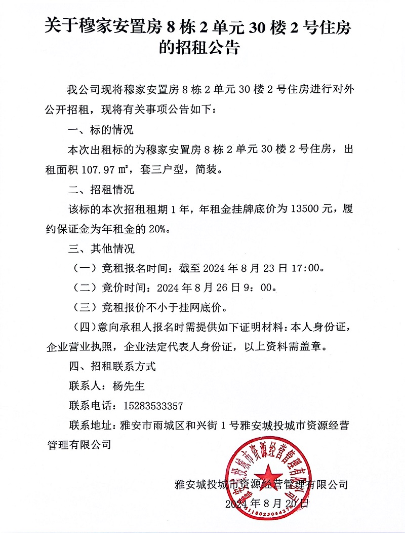 關(guān)于穆家安置房8棟2單元30樓2號住房的招租公告