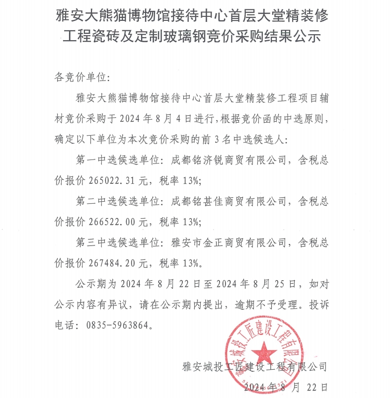雅安大熊貓博物館接待中心首層大堂精裝修工程瓷磚及定制玻璃鋼競價(jià)采購結(jié)果公示