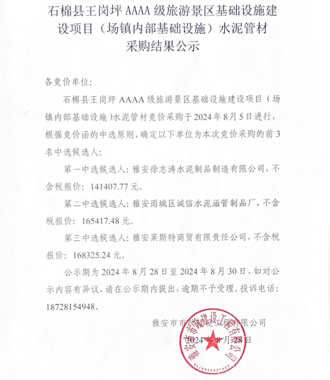 石棉縣王崗坪AAAA級(jí)旅游景區(qū)基礎(chǔ)設(shè)施建設(shè)項(xiàng)目(場(chǎng)鎮(zhèn)內(nèi)部基礎(chǔ)設(shè)施)水泥管材采購結(jié)果公示