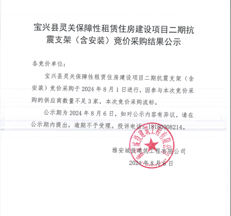寶興縣靈關(guān)保障性租賃住房建設(shè)項(xiàng)目二期抗震支架(含安裝)競價(jià)采購結(jié)果公示