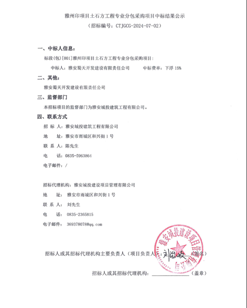 雅州印項(xiàng)目土石方工程專業(yè)分包采購(gòu)項(xiàng)目中標(biāo)結(jié)果公示