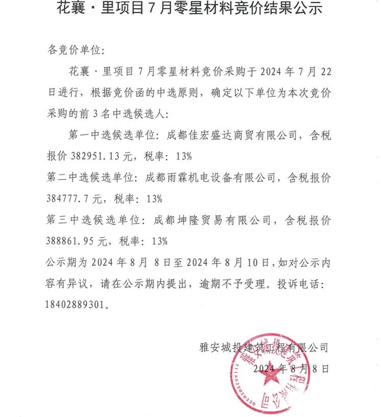 花襄·里項(xiàng)目7月零星材料競(jìng)價(jià)結(jié)果公示