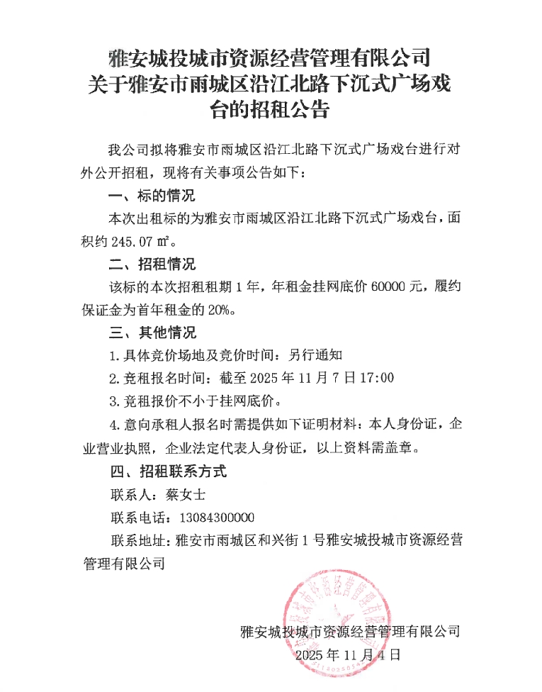 雅安城投城市資源經(jīng)營管理有限公司關(guān)于雅安市雨城區(qū)沿江北路下沉式廣場戲臺(tái)的招租公告
