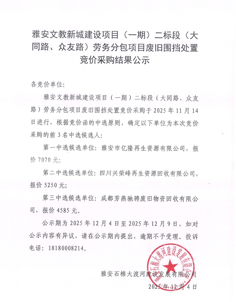 雅安文教新城建設(shè)項目(一期)二標段(大同路、眾友路)勞務(wù)分包項目廢舊圍擋處置競價采購結(jié)果公示