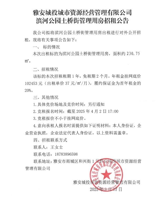雅安城投城市資源經(jīng)營(yíng)管理有限公司濱河公園土橋街管理用房招租公告