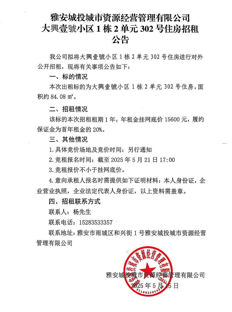 雅安城投資源經(jīng)營(yíng)管理有限公司大興壹號(hào)小區(qū)1棟2單元302號(hào)住房招租公告