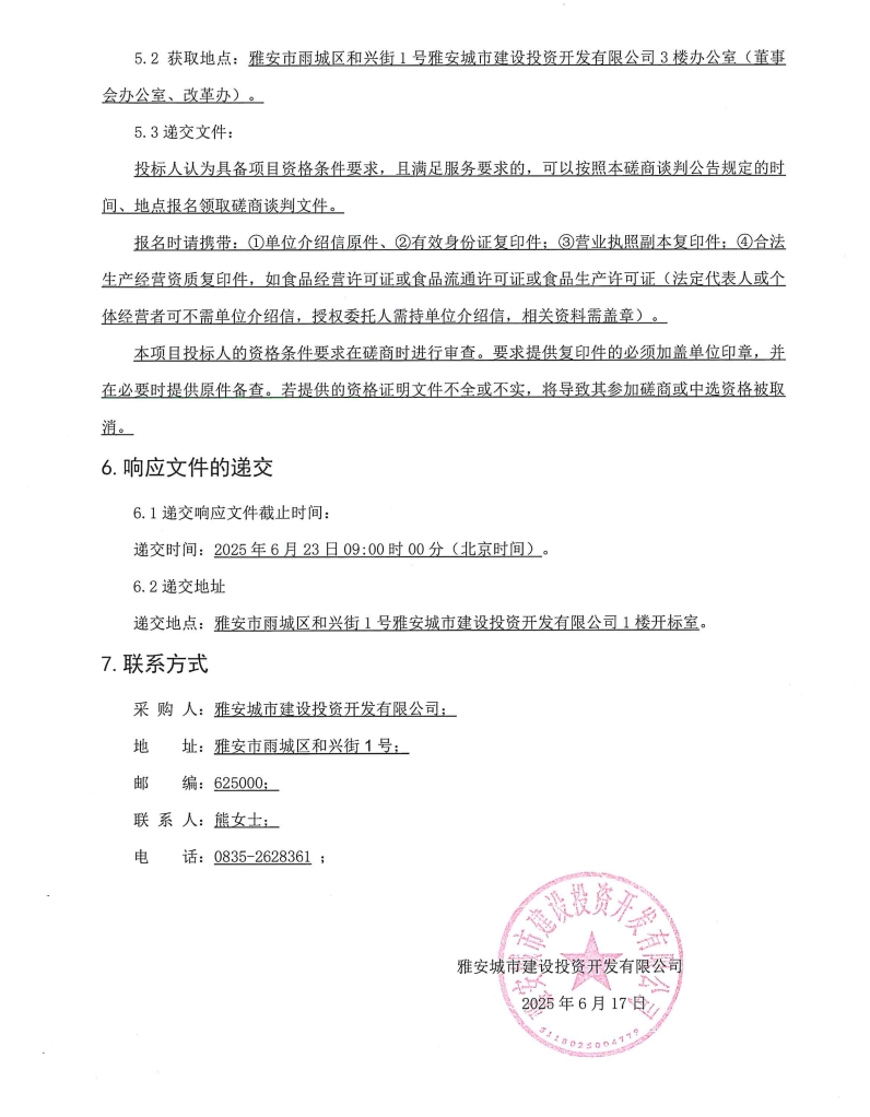 雅安城市建設(shè)投資開(kāi)發(fā)有限公司城投辦公樓食堂食材(肉類及蔬果類)采購(gòu)項(xiàng)目磋商談判采購(gòu)公告
