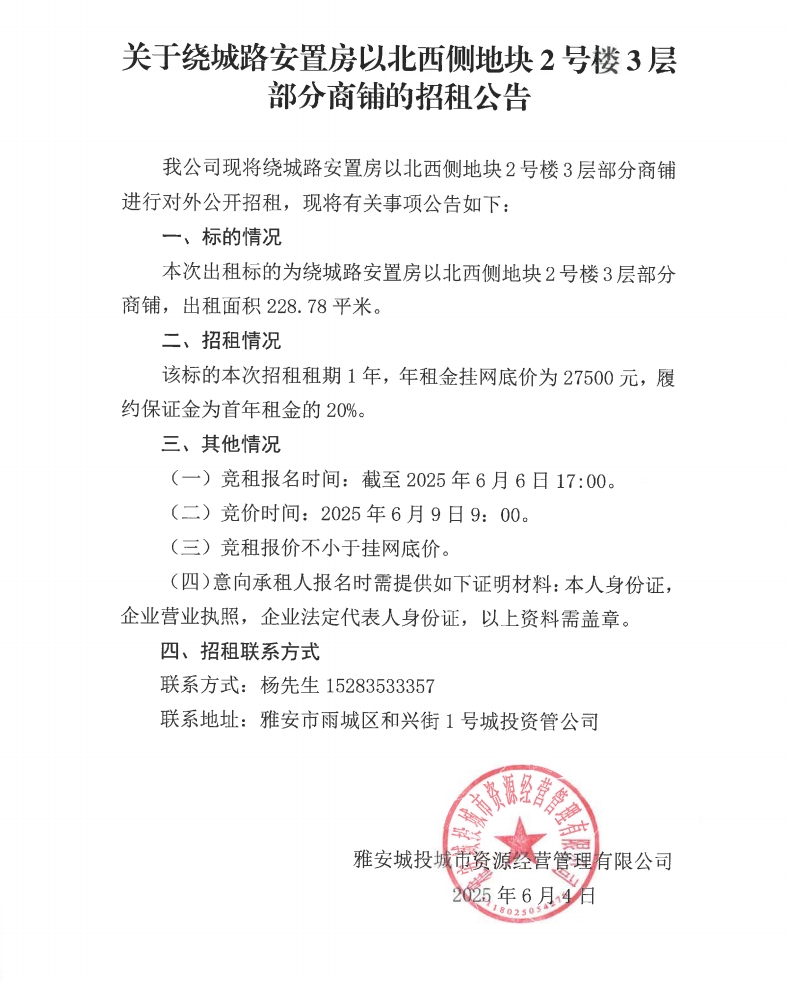關(guān)于繞城路安置房以北西側(cè)地塊2號(hào)樓3層部分商鋪的招租公告