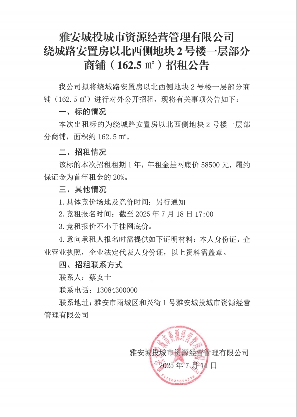 繞城路安置房以北西側(cè)地塊2號(hào)樓一層部分商鋪(162.5㎡)招租公告