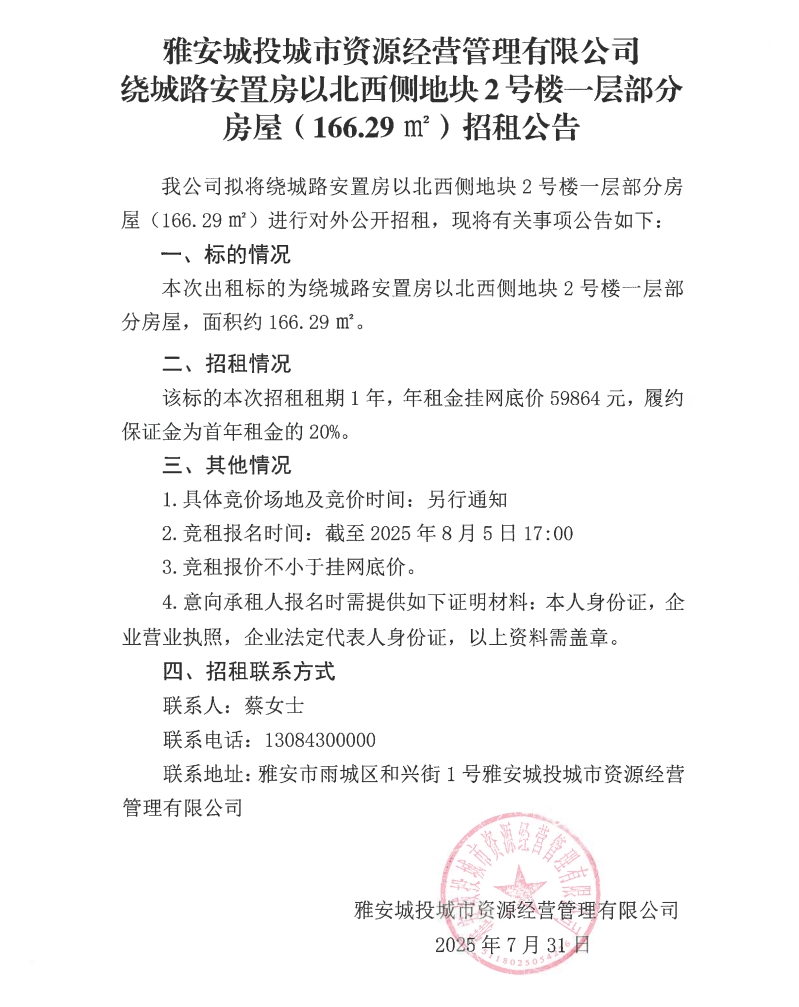 雅安城投城市資源經(jīng)營管理有限公司繞城路安置房以北西側(cè)地塊2號(hào)樓一層部分房屋(166.29m²)招租公告