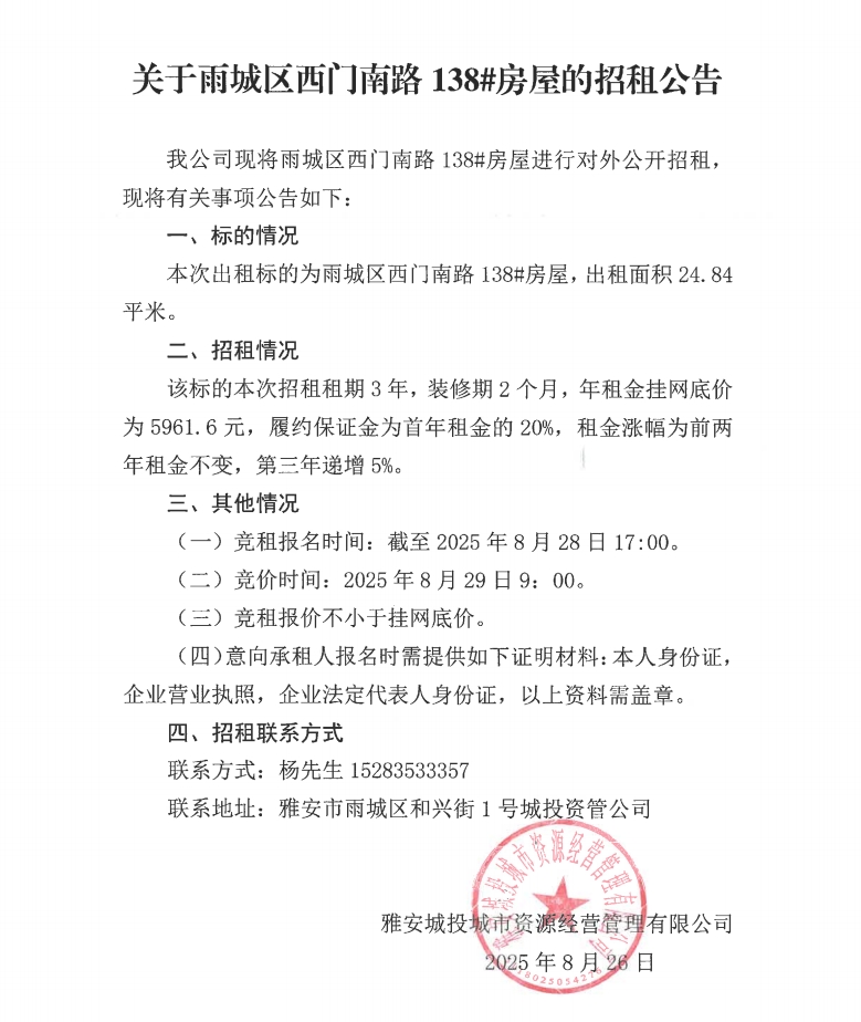 關(guān)于雨城區(qū)西門(mén)南路138#房屋的招租公告