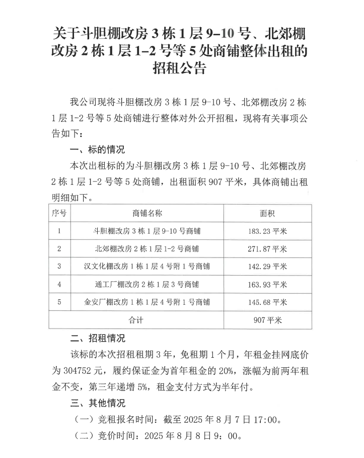 關(guān)于斗膽棚改房3棟1層9-10號、北郊棚改房2棟1層1-2號等5處商鋪整體出租的招租公告