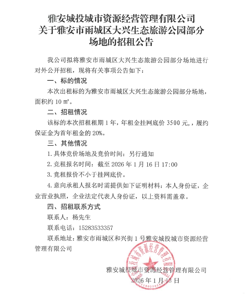 雅安城投城市資源經(jīng)營(yíng)管理有限公司關(guān)于雅安市雨城區(qū)大興生態(tài)旅游公園部分場(chǎng)地的招租公告
