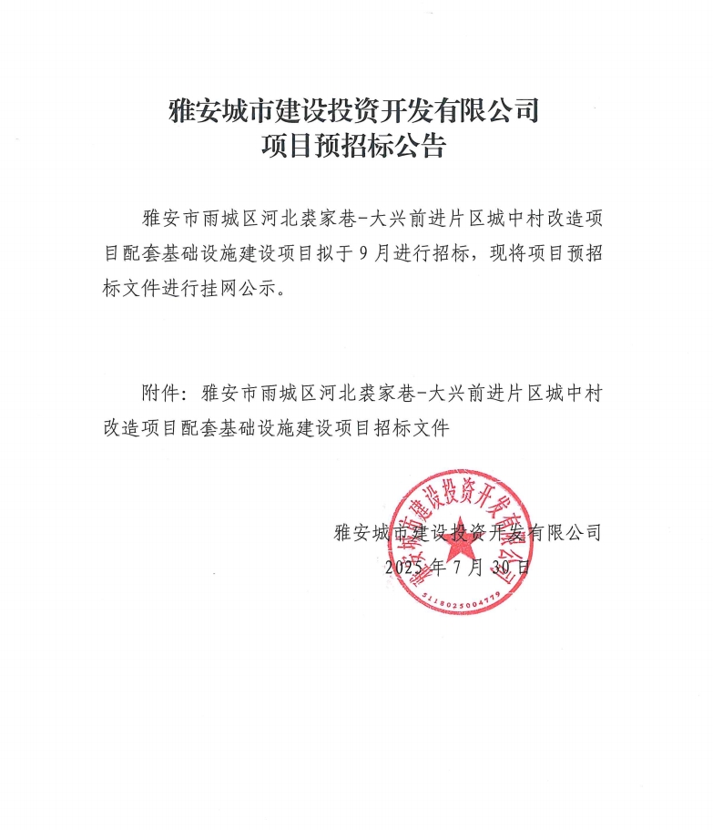 雅安市雨城區(qū)河北裘家巷-大興前進(jìn)片區(qū)城中村改造項(xiàng)目配套基礎(chǔ)設(shè)施建設(shè)項(xiàng)目預(yù)招標(biāo)公告