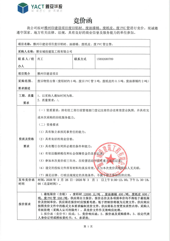雅州印建設(shè)項(xiàng)目廢舊鋁材、油漆桶、廢紙皮、廢PVC管出售