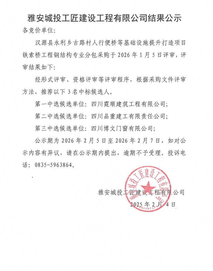 漢源縣永利鄉(xiāng)古路村人行便橋等基礎(chǔ)設(shè)施提升打造項(xiàng)目鐵索橋工程鋼結(jié)構(gòu)專業(yè)分包采購結(jié)果公示