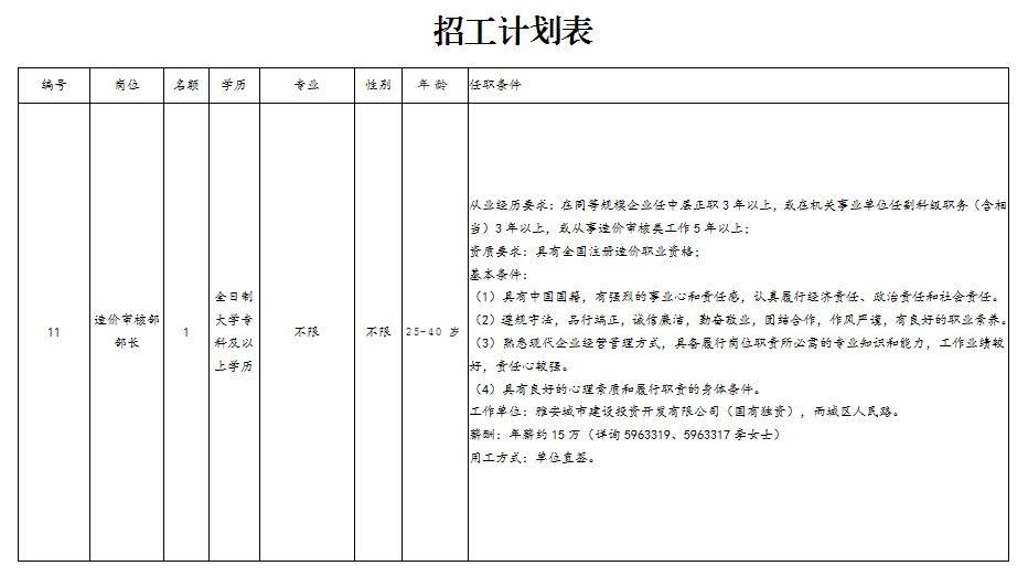雅安城市建設投資開發(fā)有限公司造價審核部部長1名。