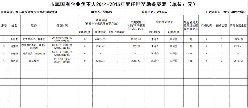 市屬國有企業(yè)負(fù)責(zé)人2014-2015年度任期獎勵備案表