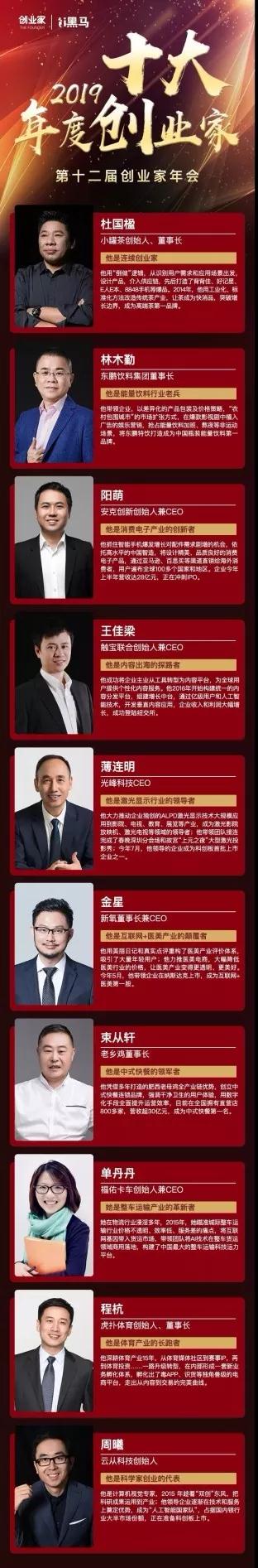 小罐茶董事長杜國楹、東鵬飲料集團董事長林木勤、安克創(chuàng)新創(chuàng)始人兼CEO陽萌、頭條觸寶聯(lián)合創(chuàng)始人兼CEO王佳梁、光峰科技CEO薄連明、新氧董事長兼CEO金星、老鄉(xiāng)雞董事長束從軒、福佑卡車創(chuàng)始人兼CEO單丹丹、虎撲體育董事長程杭、云從科技創(chuàng)始人周曦,被評為2019年度十大創(chuàng)業(yè)家。